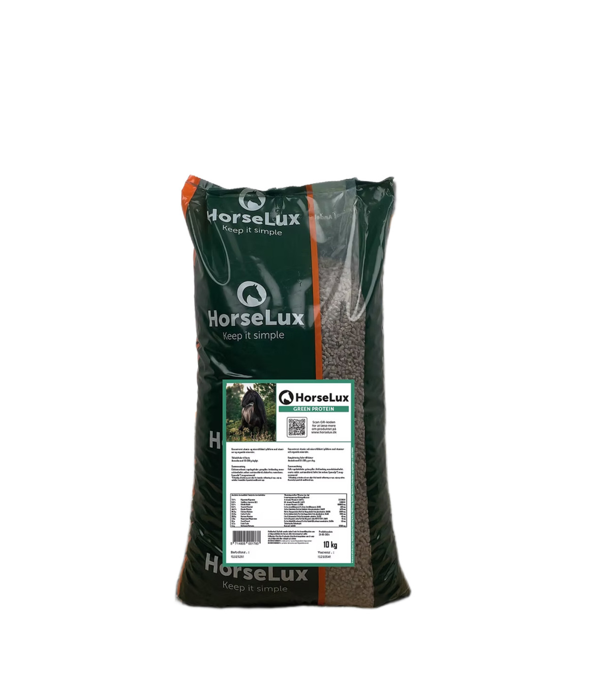 HorseLux Green Protein er et rent og naturligt proteintilskud, der dækker hestens behov for ekstra protein, når det daglige foder ikke er tilstrækkeligt. Det er særligt velegnet til heste, der får grovfoder med lavt proteinindhold, til drægtige og diegivende hopper samt til heste i arbejde, som skal opbygge muskler og energi.