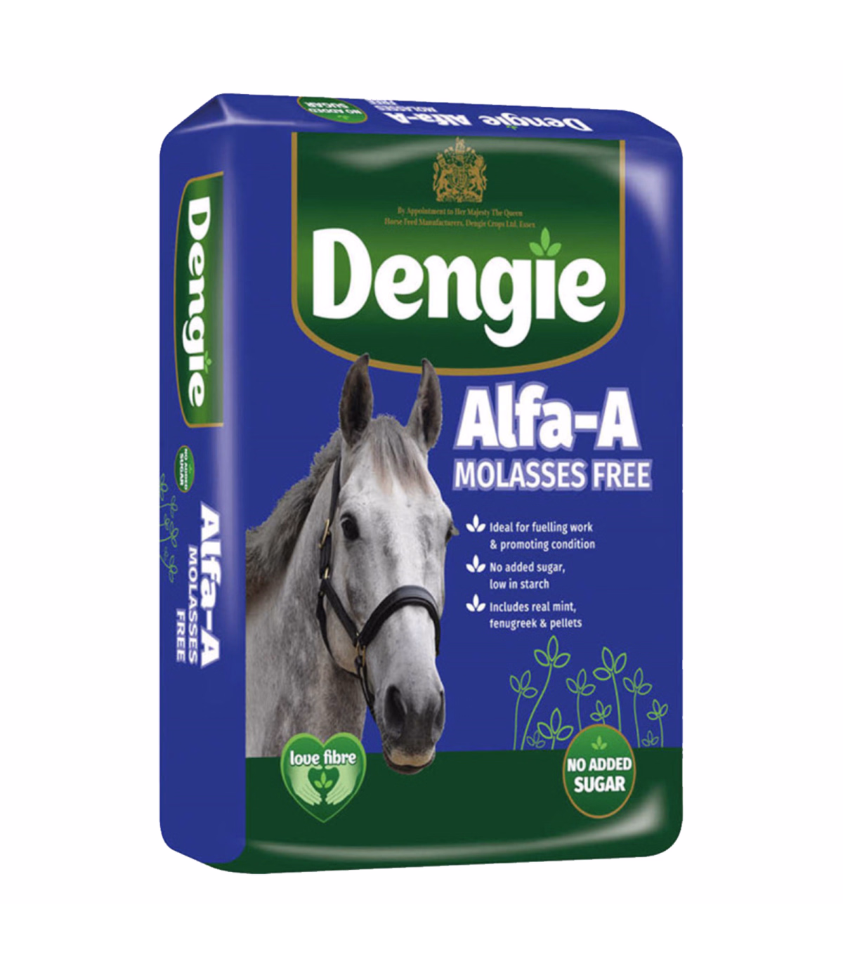 Produktet består af en blanding af lucernestruktur og lucernepiller, som er coatet med koldpresset rapsolie og beriget med sunde urter som bukkehorn og mynte. Disse urter har ikke kun en god smag, men også en positiv effekt på hesten. Produktet er velegnet til heste, som er følsomme overfor sukker og stivelse, men som samtidig har brug for et foder med et højt indhold af fibre og protein af høj kvalitet.Dengie Alfa-A Molasses Free indeholder hele lucerneplanten, inklusiv de næringsrige blade, som giver en blød struktur, som er typisk for Dengie's lucerner. Alfa-A kan bruges som en stor del af hestens foderplan, eller som det eneste foder sammen med vitaminer og mineraler (f.eks. Salvana Hestevitamin og mineral) og hø til de heste, som ikke har behov for kraftfoder.Alfa-A Molasses Free er et meget naturligt produkt, som ikke indeholder nogen former for konserveringsmidler eller tilsætningsstoffer.