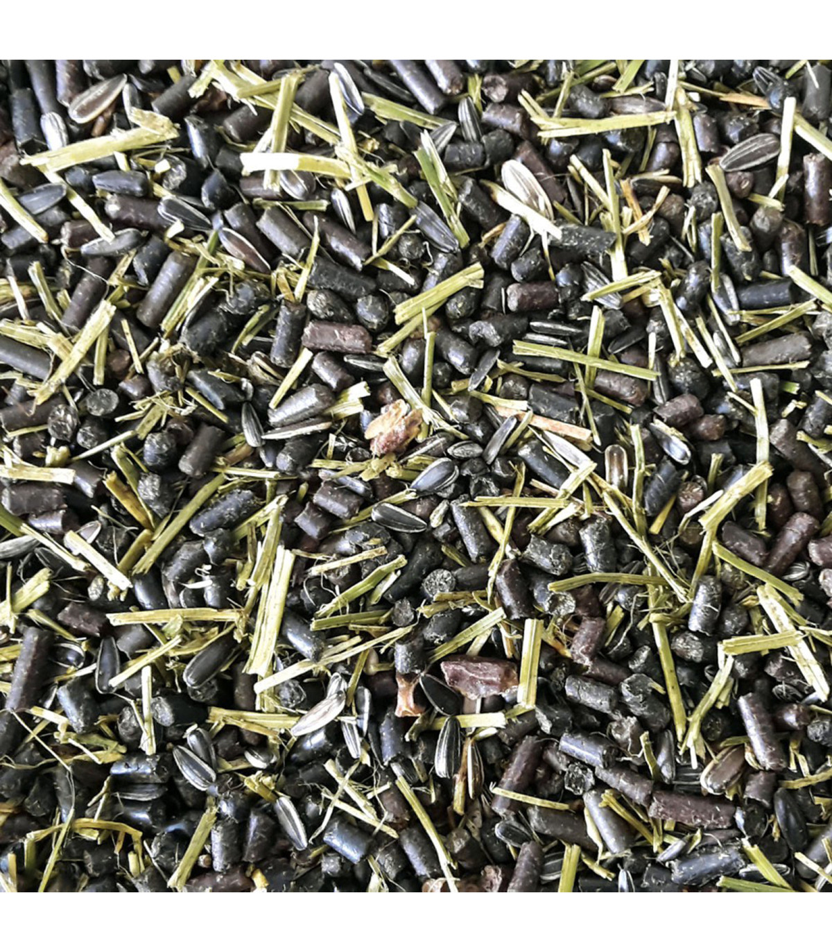 Foderet har et optimalt protein- og energiforhold samt et højt vitaminindhold, som sikrer motivation og effektiv muskelopbygning. Foderet er baseret på marietidselolie og risklid, som giver energi uden at belaste tarmfloraen og insulinbalancen. Foderet indeholder også solsikkefrø, som bidrager med vegetabilske olier, lecithin og sekundære plantestoffer.