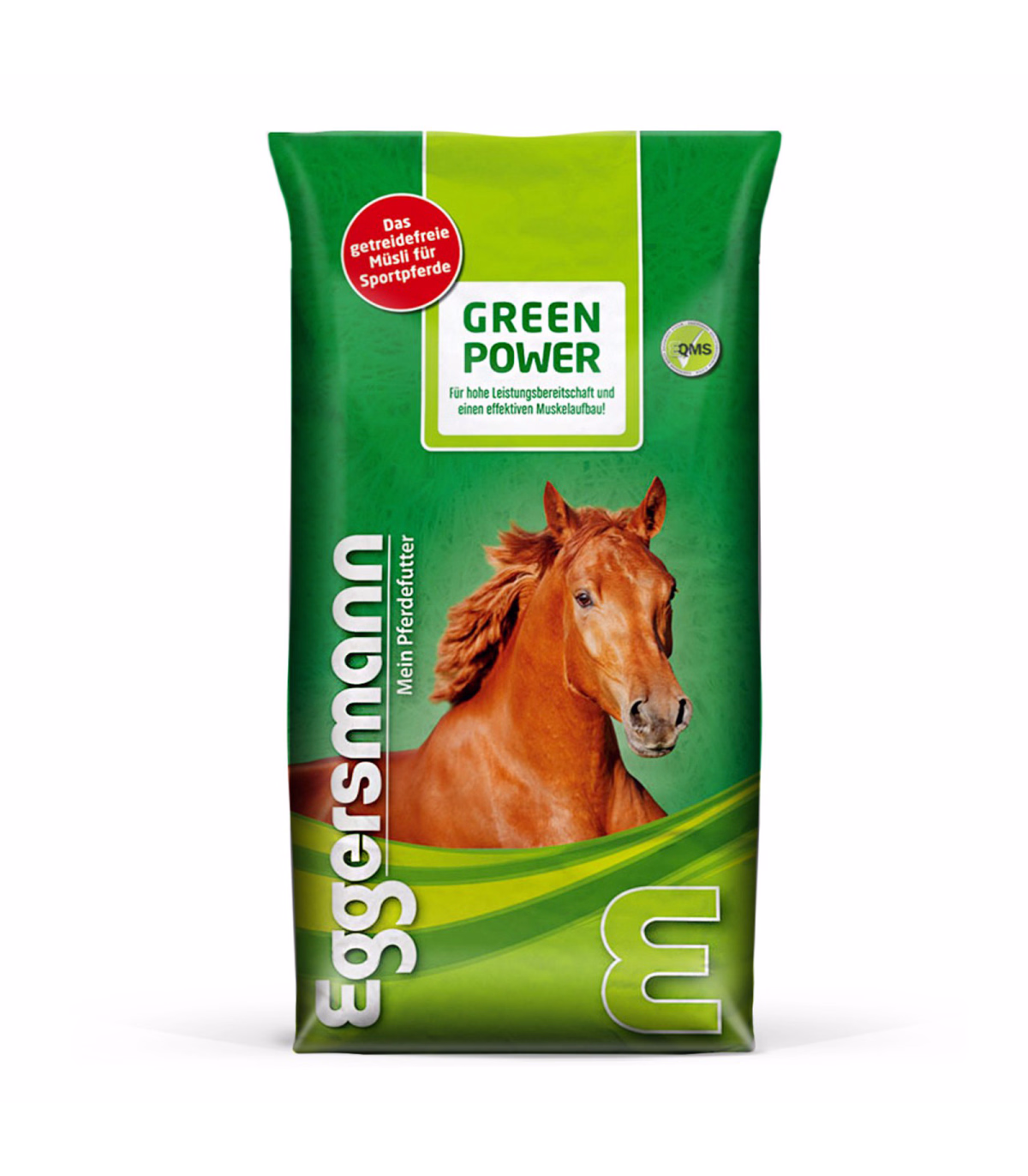Eggersmann Green Power er et kornfrit tilskudsfoder til heste, der har brug for ekstra energi og protein. Det er velegnet til heste i træning og konkurrence samt til avlshopper. Foderet har et lavt indhold af stivelse og sukker, men et højt indhold af struktur, der fremmer tyggeintensiteten og et sundt mave-tarmmiljø.