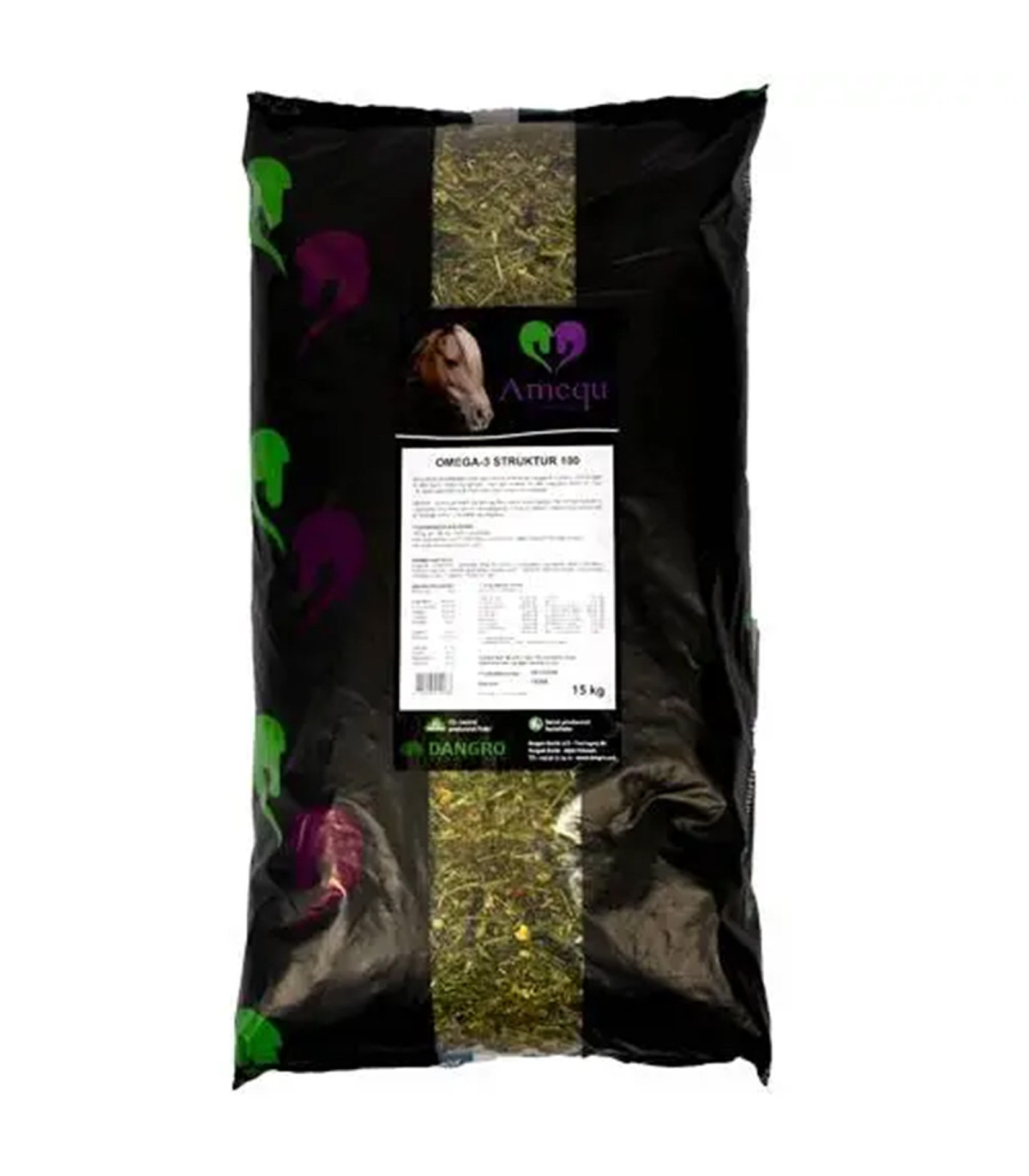 Amequ Omega-3 Struktur 100 er et koncentreret kraftfoder til heste og ponyer, der udfodres med 100 g pr. 100 kg kropsvægt. Foderet har lavt stivelses- og sukkerindhold, højt indhold af fordøjelige fibre og omega-3 fedtsyrer. Energien frigives langsomt, og foderet indeholder organiske vitaminer, mineraler samt en urteblanding. Velegnet til individuel fodring sammen med grovfoder, med mulighed for supplerende energikilde. Pakning: 15 kg.