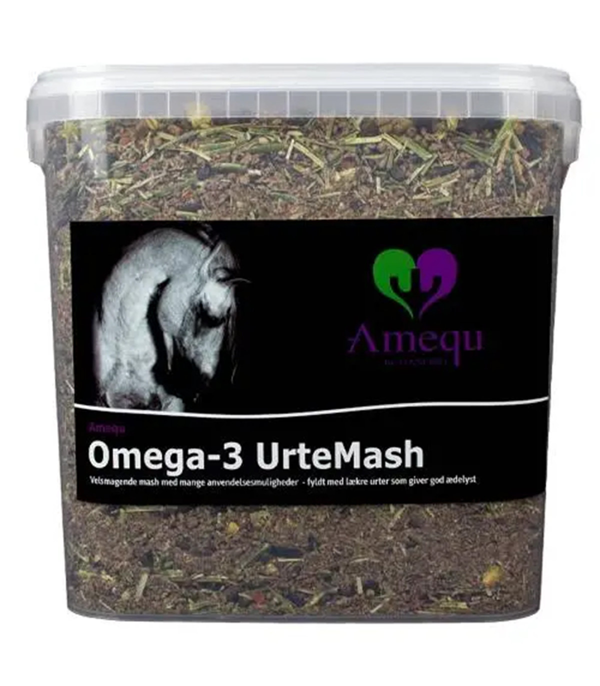Amequ Omega-3 UrteMash er et velsmagende og velduftende suppleringsfoder, tilsat en kombination af urter, gulerødder, æble og klid. Mashen har et lavt indhold af stivelse og sukker, hvilket gør den velegnet til alle heste, uanset aktivitetsniveau. Den kan anvendes som ekstra energi, til at tilføje væske, eller som hjælp til at få hesten til at indtage medicin og tilskudsprodukter. Mashen kan serveres varm på kolde dage eller kold som supplement på varme dage og stævner.