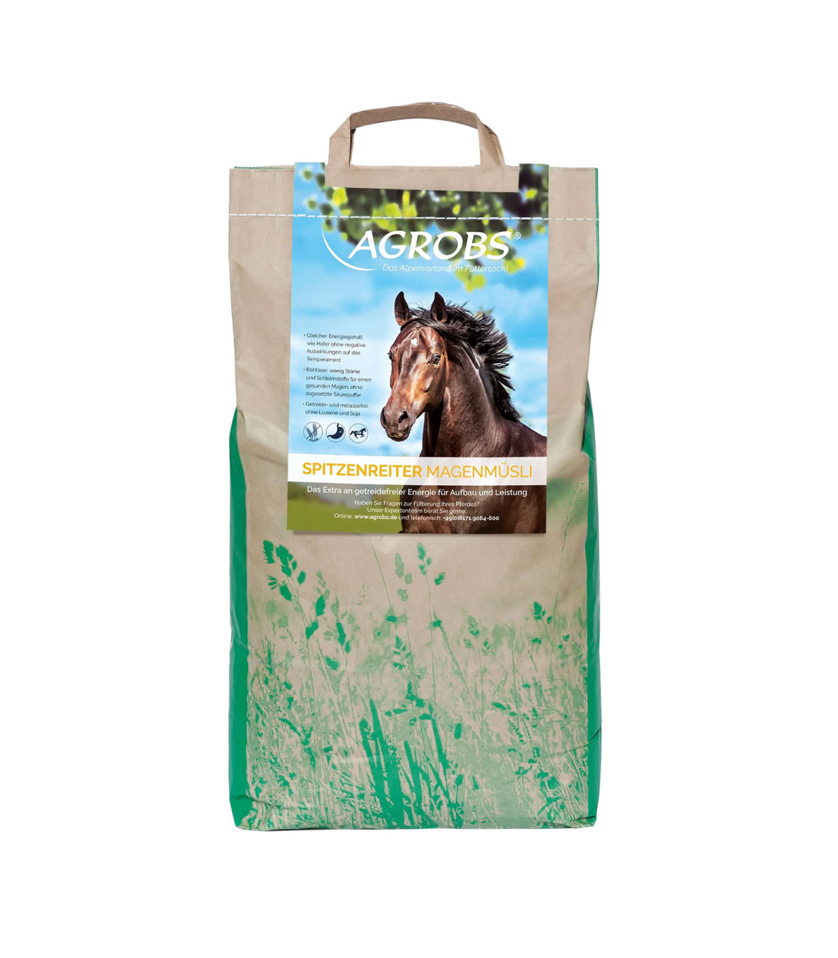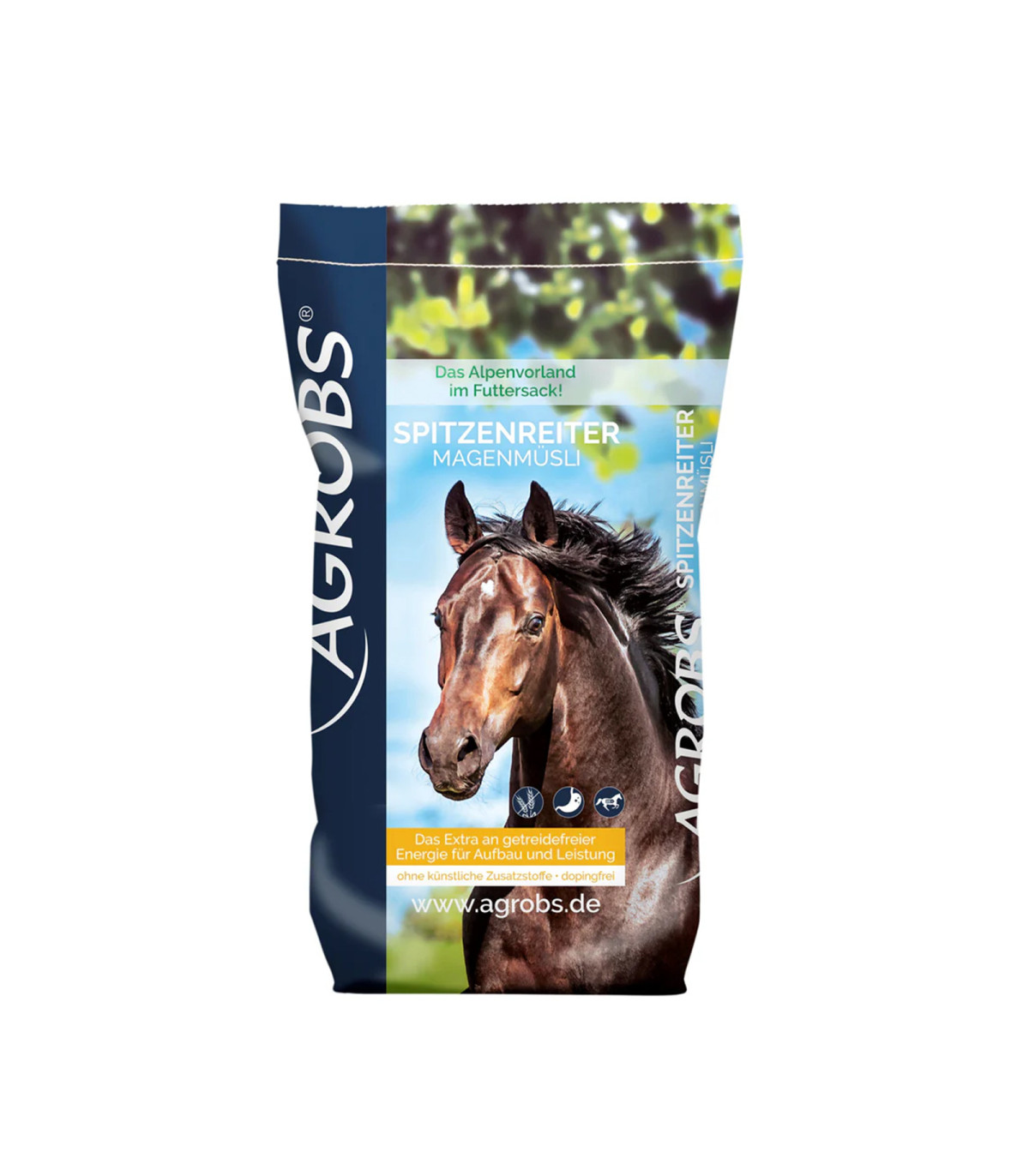 Agrobs Spitzenreiter Magenmüsli er et korn- og melassefrit krybbefoder, der giver din hest langsomt frigivet energi uden at påvirke temperamentet.