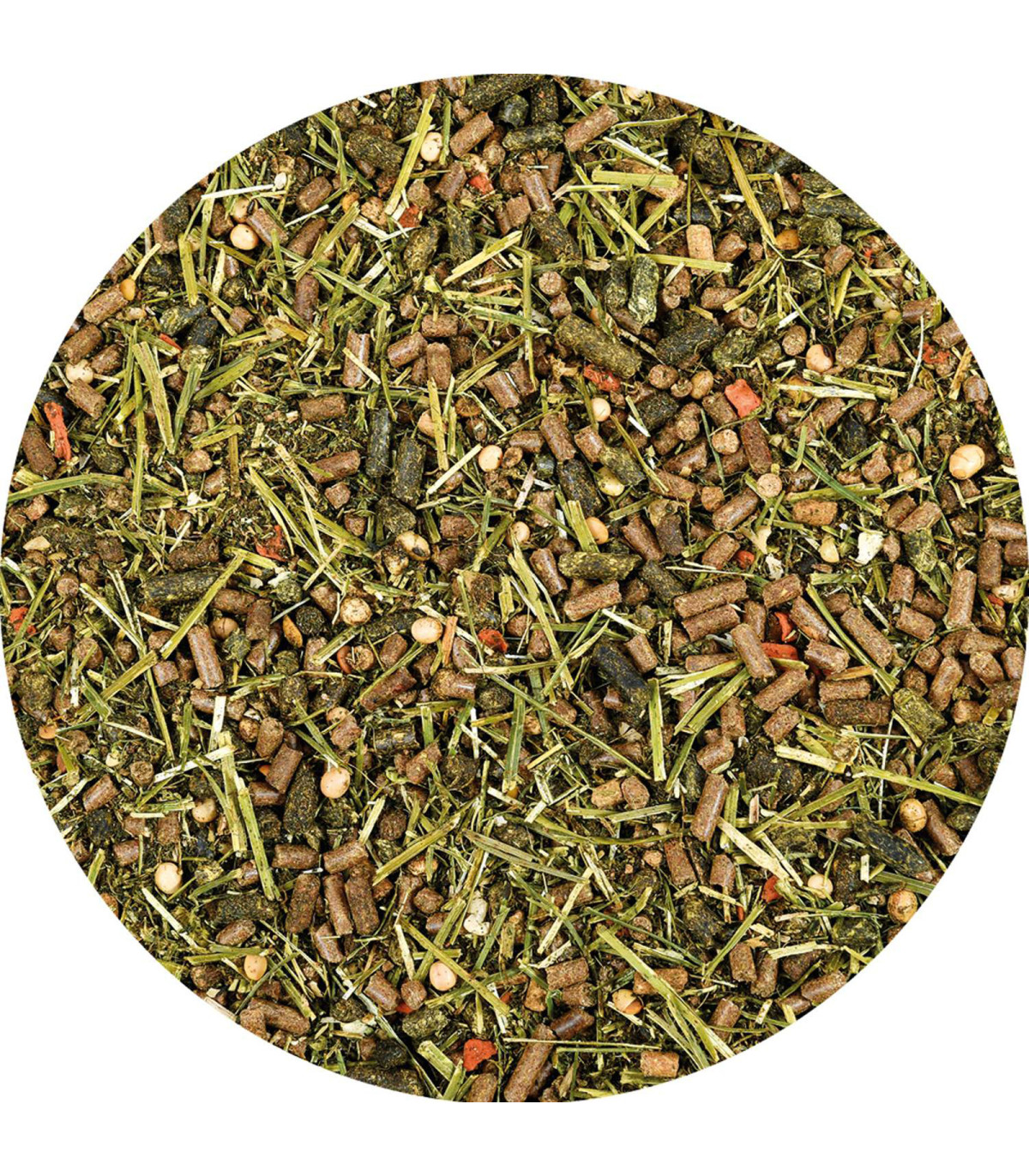 Foderet indeholder en høj andel af fibre fra lucerne, gulerodsflager og ærteflager, som giver lang tyggetid, fremmer spytproduktionen og understøtter en sund og stabil fordøjelse.