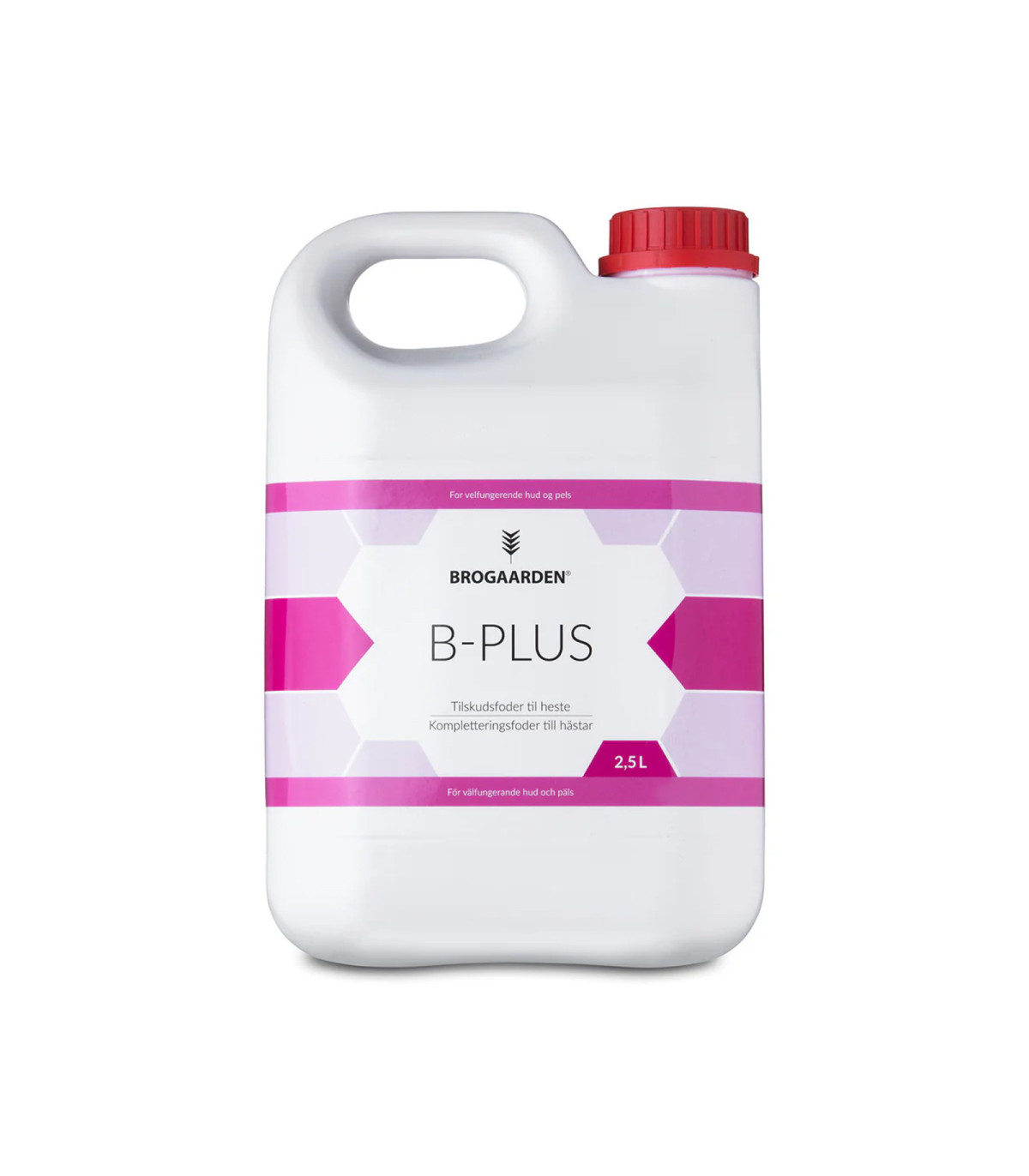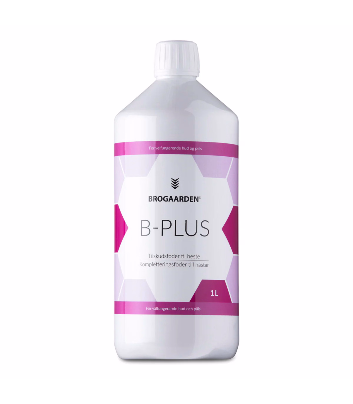 Brogaarden B-Plus er et effektivt flydende tilskud af B-vitaminer, der understøtter hestens velvære i perioder med øget behov. Produktet er formuleret af biokemiker Jim Fielden og tilpasset hestens naturlige fysiologi, så det bidrager optimalt under pelsskifte, stress, konkurrence, fertilitet og ubalance i fordøjelsen.