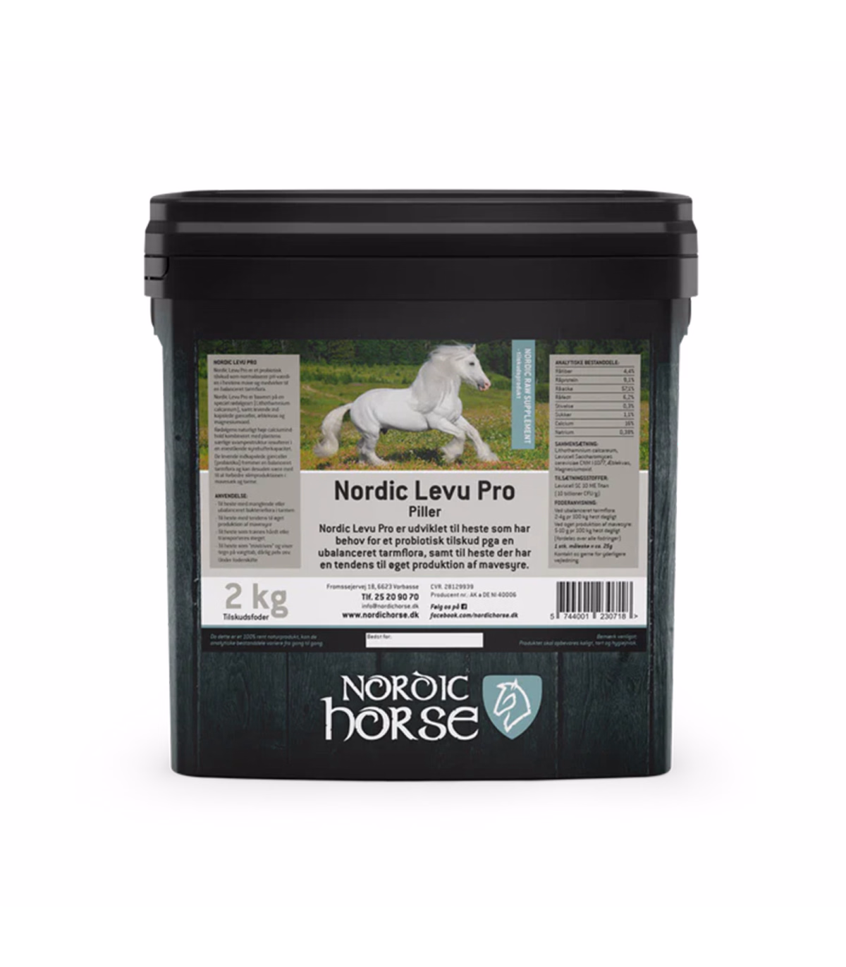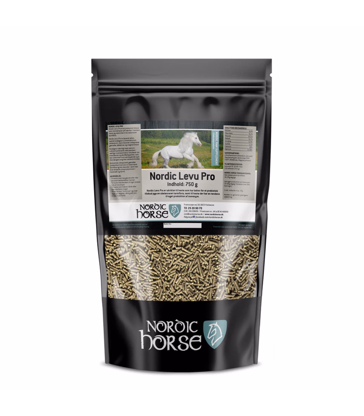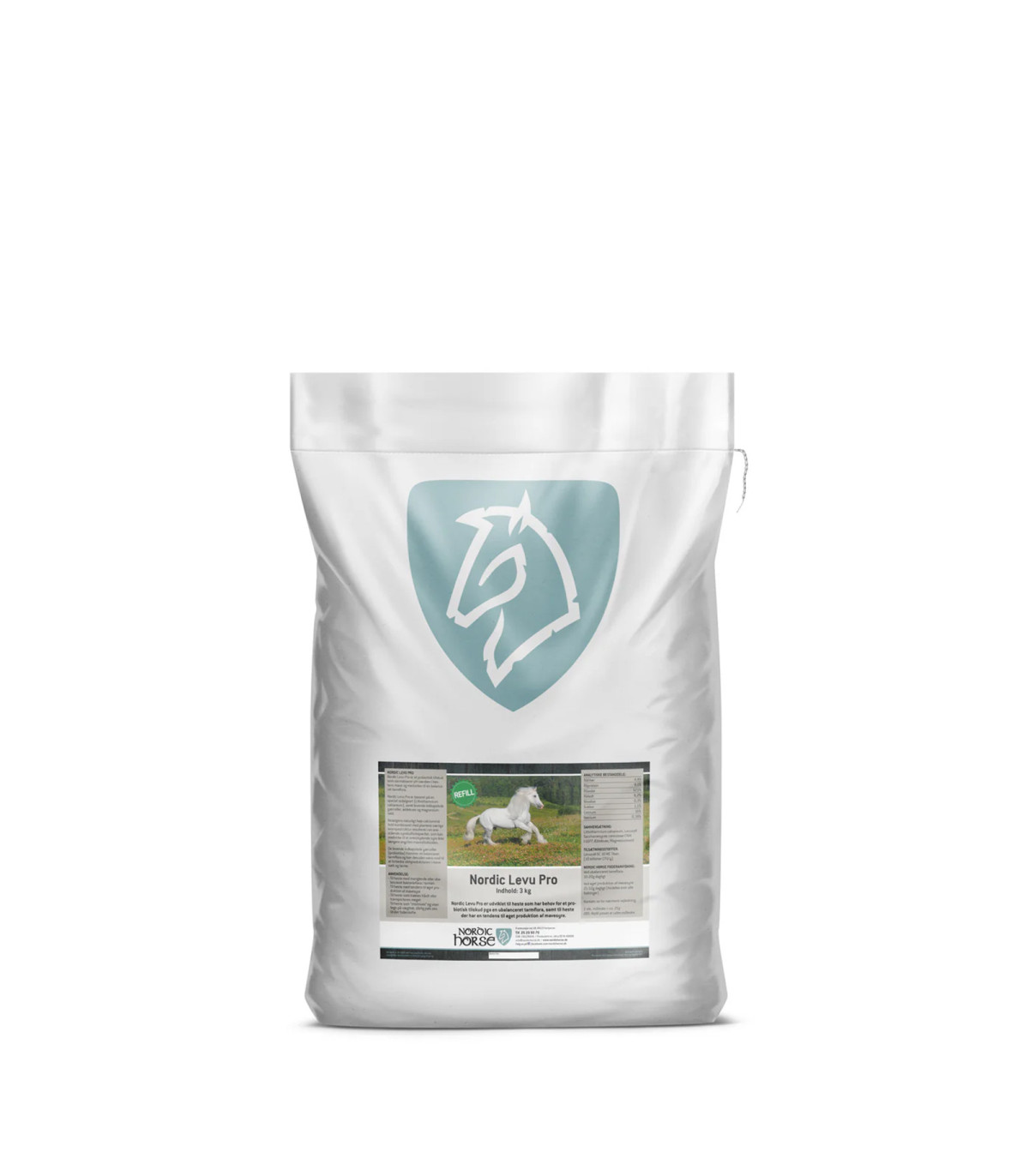 Nordic Levu Pro er et naturligt tilskud til heste, der har brug for støtte til fordøjelsen. Med algekalk, levende gærceller, æblekvas og magnesiumoxid hjælper det med at opretholde en balanceret tarmflora og optimal syrebuffer. Velegnet til heste under foderskifte, transport eller hård træning. Fås i 750 g, 2 kg og 3 kg.